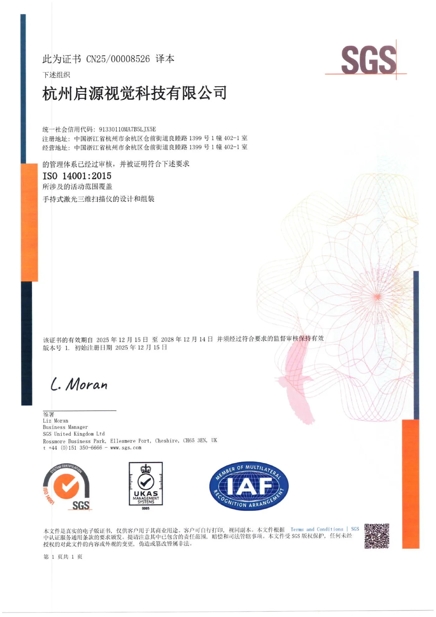 2025年12月,杭州启源视觉科技有限公司成功通过ISO 9001:2015质量管理体系、ISO 14001:2015环境管理体系及ISO 45001:2018职业健康安全管理体系三项国际标准认证,本次认证由国际公认的测试、检验和认证机构SGS(UK)严格审核并颁发,覆盖公司核心业务“手持式激光三维扫描仪的设计和组装”。