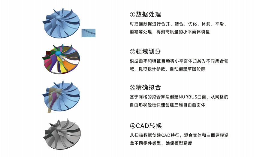 从扫描到生成可用数据的过程非常高效,支持实时预览和初步处理,AI算法能加速数据处理和拼接,大幅缩短逆向工程周期。