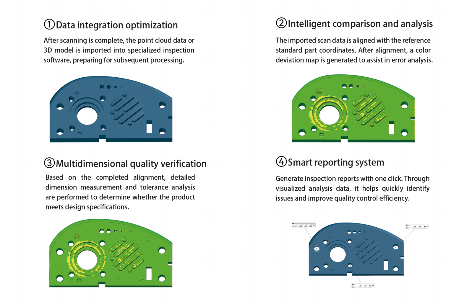 The AlphaScan AI metrology-grade handheld 3D scanner leverages advanced AI algorithms and super-resolution 3D reconstruction technology to deliver industry-leading precision as high as 0.020 mm—equivalent to just one-quarter the diameter of a human hair—and boasts an impressive scanning rate of up to 7.1 million points per second. Designed to be lightweight (the device weighs approximately 1070 grams), it supports non-contact measurements, enabling rapid acquisition of detailed 3D point cloud data from object surfaces while generating highly accurate 3D models. This versatile tool finds extensive applications across diverse industries, including automotive manufacturing, mold making, aerospace, photovoltaic energy, healthcare, and machining—helping companies streamline critical tasks such as quality control, reverse engineering, dimensional inspection, and defect analysis. When conducting industrial inspections with AlphaScan, a standardized workflow is typically followed to ensure data accuracy and reliability. The core process consists of four key steps: