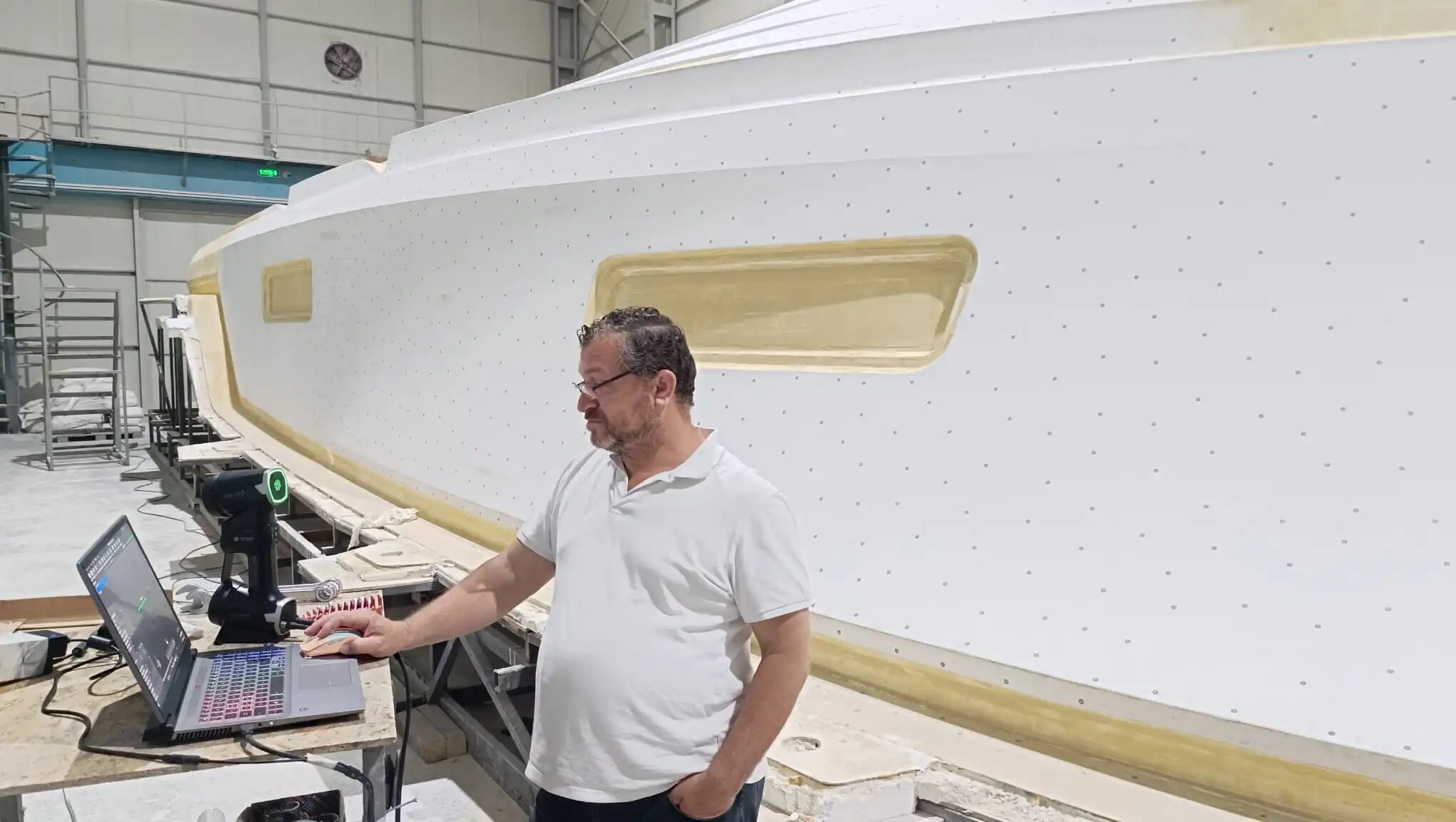 Amid the roaring sounds of machinery, The technical team from Qiyuan Vision’s Turkish distributor is currently using the AlphaScan 3D scanner to carry out a scanning operation on a 14-meter-long engineering vessel. 。