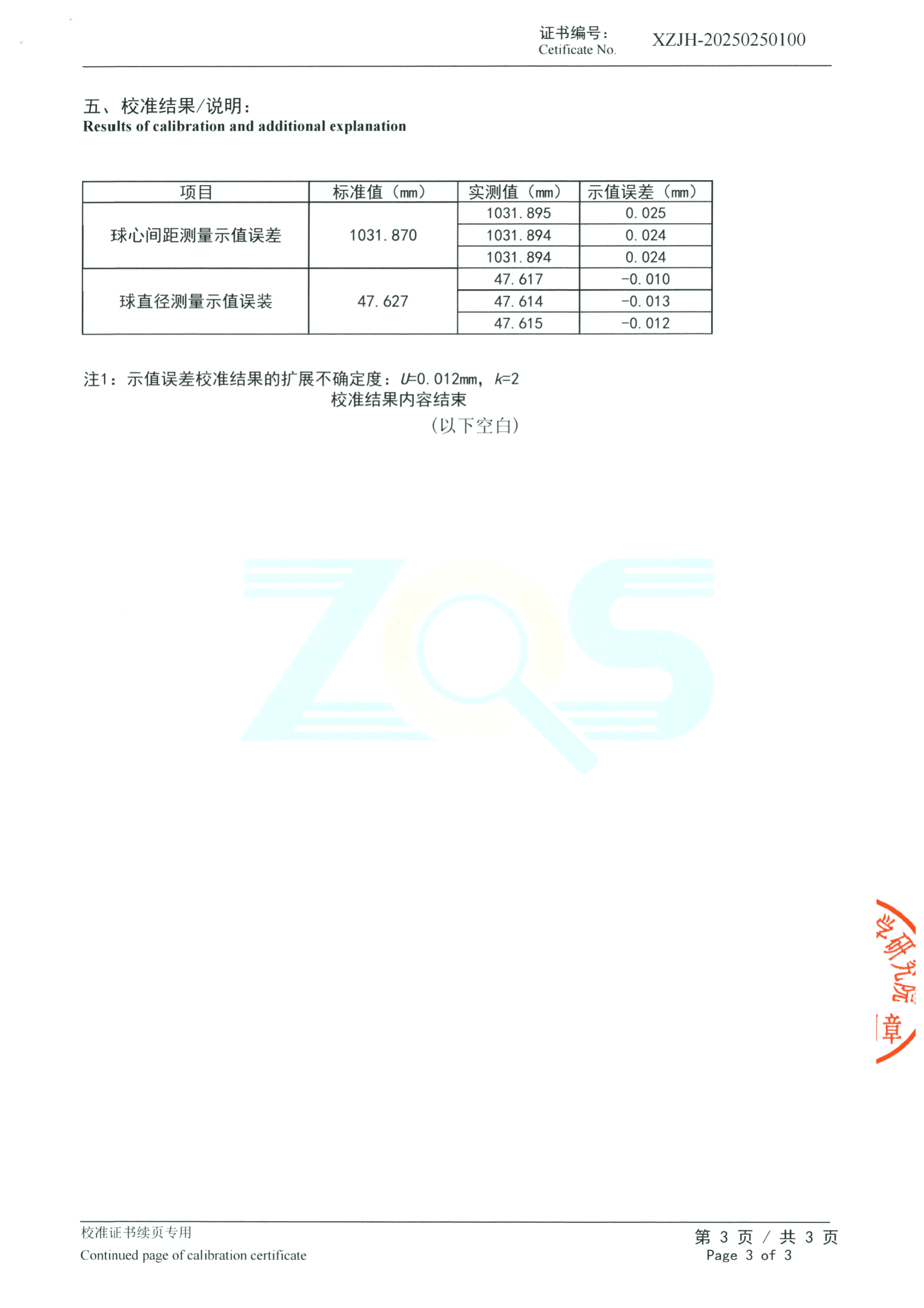 Ultra-precise accuracy: The center-to-center distance error is a mere 0.024 mm, while the sphere diameter error is as low as ±0.013 mm. The expanded uncertainty stands at 0.012 mm (k = 2), ensuring details are captured with pinpoint precision—down to the “micron level”!