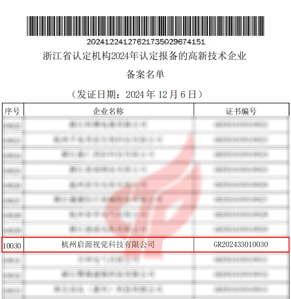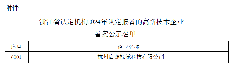 According to the relevant provisions of the “Administrative Measures for the Recognition of High-Tech Enterprises” (Guo Ke Fa Huo [2016] No. 32) and the “Guidance on the Management of High-Tech Enterprise Recognition” (Guo Ke Fa Huo [2016] No. 195), Hangzhou Qiyuan Visual Technology Co., Ltd. has successfully passed the review process for the “2024 High-Tech Enterprise Recognition Filing.” 。 (Documents and notices attached below)