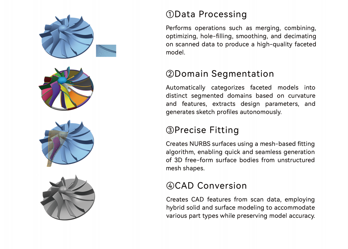 The process from scanning to generating usable data is highly efficient, enabling real-time preview and initial processing. AI algorithms significantly accelerate data handling and stitching, dramatically reducing the reverse engineering cycle time.